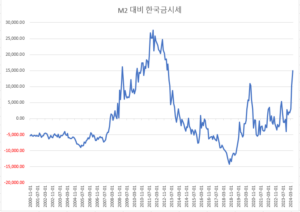 => 한국 M2 추세선과 한국금시세를 비교